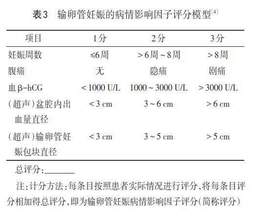 3.4.1 疾病分期 (1)未破损期:输卵管妊娠未发生破裂或流产。(2)已破损期:输卵管妊娠已发生破裂或流产。
