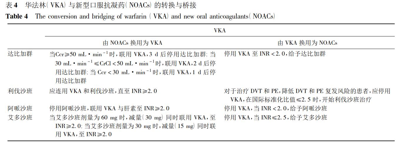 华法林与 NOACs 之间的转换与桥接方案主要来自药品说明书,见表 4。