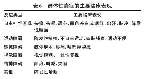 急性群体性发病,在校、年长儿童为主,常在同一区域、同一环境下的人群,在同一时间段内受同一刺激后发作,起病急骤,暗示性强,发病人群可快速扩散。临床表现多样化,可反复短暂发作,以自主神经系统功能紊乱为主,主观症状明显而无明显阳性体征(见表6) 。癔症虽然不会导致躯体损害后果,但极容易引起非常恶劣的社会性群体恐慌事件,必须果断进行紧急快速处理。
